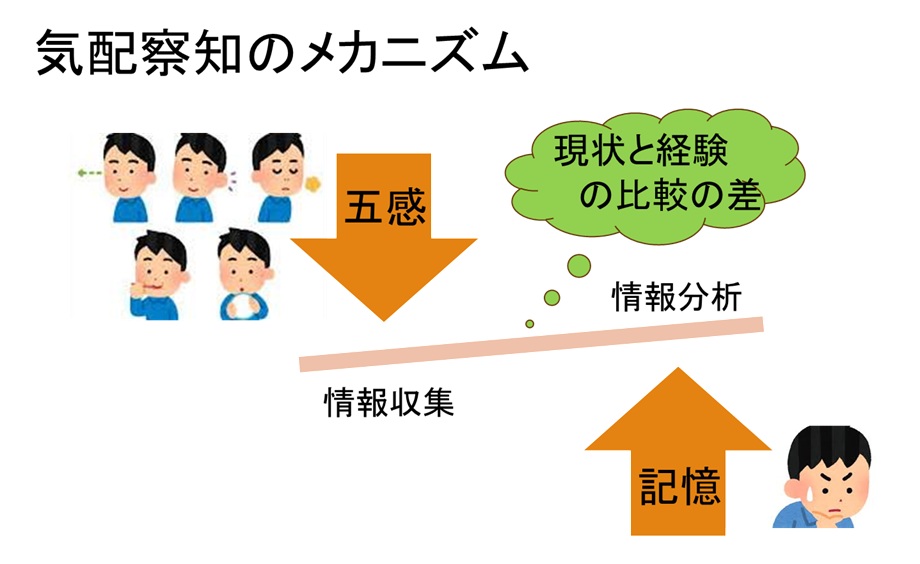 気配は情報の収集から始まります。人は視覚・聴覚・嗅覚・触覚・味覚の五感で情報を得ています。なかでも外界からの情報の約80%は視覚から得ていると言われています。気配など不特定なものは、視覚以外のもので感じ取る傾向にあります。感じとるポイントは、空気の移動と振動です。音は空気の振動です。匂いは空気が移動する事で感じやすくなります。触覚では直接触れること以外にも、空気の振動・移動を皮膚や体毛で感じ取っています。